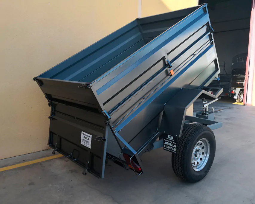 Descripción del producto: Remolque serie 4×4 reforzados, fabricado en acero negro de 1,5 y 2,0 mm completamente soldado, imprimado y pintado con pintura de poliuretano metalizada, 1 eje de 1.825 kg marca al-ko o knott (mma 750 kg), 2 ruedas 235/75 r 15″ ataque japones o 3 ruedas 185 r 14 c ataque mercedes, rueda jockey abatible de 60mm, freno de inercia y estacionamiento, basculante hidráulico bomba manual.