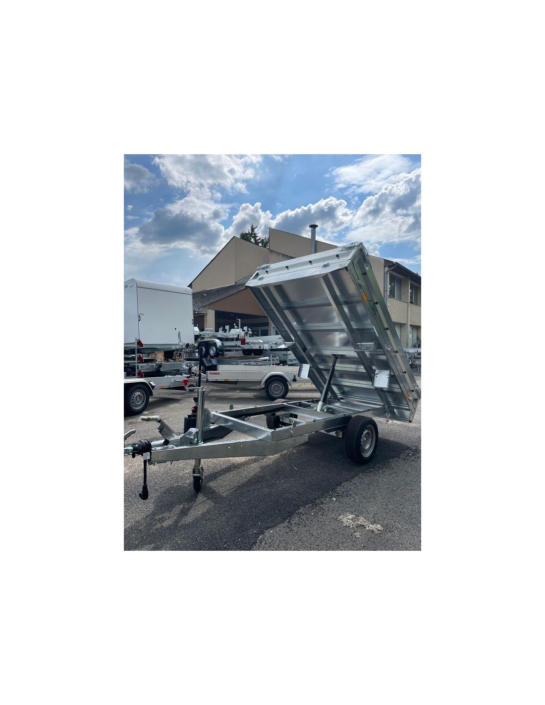 Remolque con caja basculante galvanizada, ideal para transporte versátil y robusto.